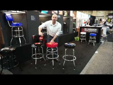 The 1657 logo bar stool features a 19 gauge chrome plated welded steel frame with footrest and nylon floor glides, and a hand upholstered 360 degree swivel seat with backrest. Logos are imprinted on the underside of 12 mm clear vinyl and can be displayed on the backrest and/or top and sides of the seat for exceptional visibility. Available in 24" counter stool or 30" bar stool height. Choose from hundreds of vinyl upholstery colors and styles to complete the perfect look. Delivers in 4 weeks after completion of sample. Minimum order of 2 pieces. Made in the USA.