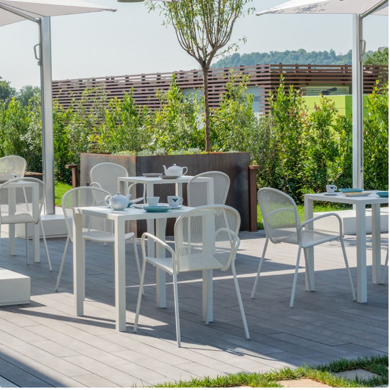 Rhonda Armchair is a Outdoor/Indoor Stacking Side Chair. This chair is in stock. This high end outdoor chair is produced in Italy and stocked in the United States. You can stack this chair 8 high to save a ton of space. The tubular stool frame uses an E-Coated powder coat finish to make sure that the frame lasts through all types of weather.